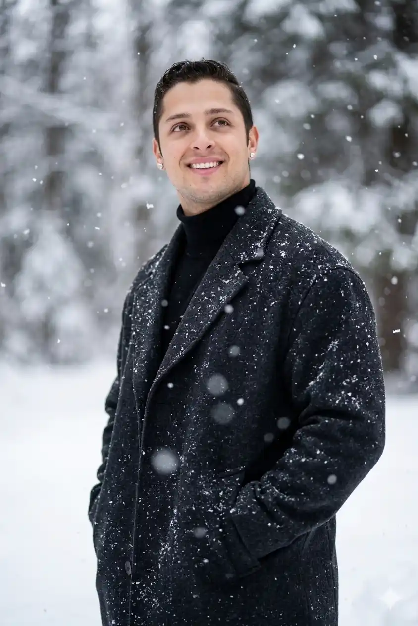 Use the face from the uploaded reference image and preserve the same facial features – do not alter the face. Cinematic and hyper realistic portrait of a young white man standing in falling snow, wearing an oversized dark wool coat dusted with snowflakes over a black turtleneck and diamond earrings. The person stands confidently with hands in pockets, tilting his head slightly upward, striking a calm and contemplative pose. Shallow depth of field with blurred snow in the foreground, high detailed texture on the coat, captured with a professional DSLR lens in soft natural light, portrait taken from a side angle.