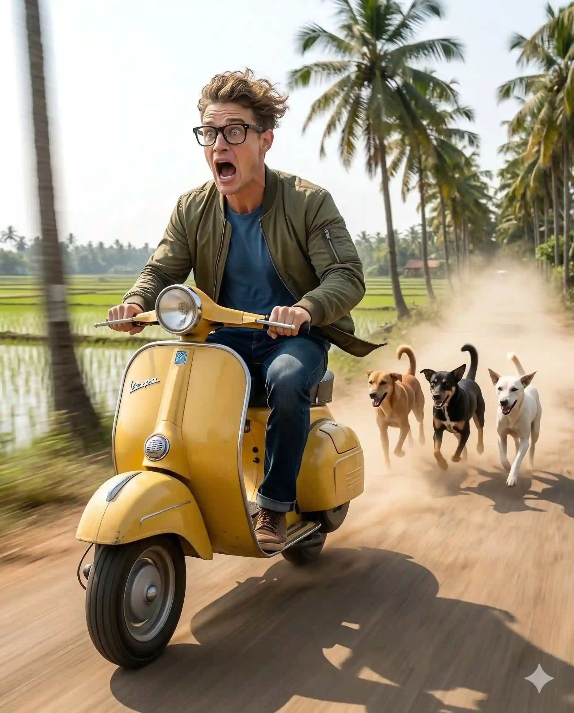Narrow winding dirt road through neon-green rice paddy fields, scattered tall coconut palm trees, bright midday sun, pale blue sky with soft wispy clouds. High-key cinematic HDR lighting with realistic shadows and crisp highlights on the scooter.